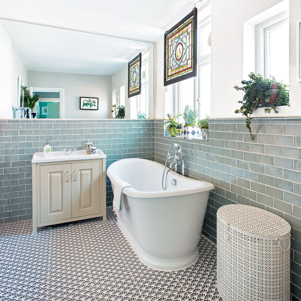Neutral bathroom with statement patterned floor ... (Gary Roberson)